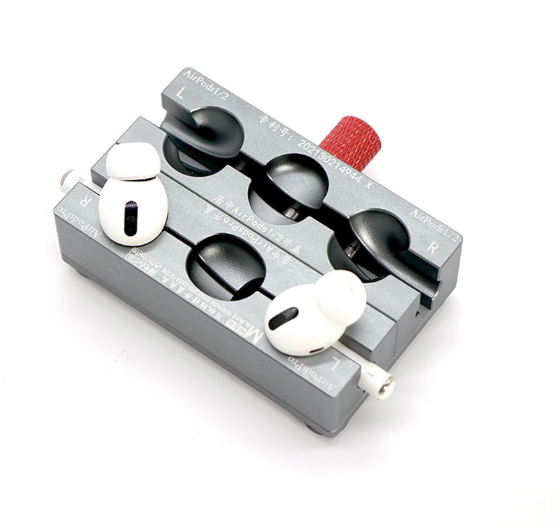 Перед началом разборки корпуса наушники размещаются в гнездах на лицевой стороне зажима в соответствии с метками L и R. После нагрева корпуса феном крышка гарнитуры легко снимается острым инструментом. Для извлечения гаджета необходимо ослабить винт. Держатель подходит для моделей наушников AirPods1, 2 и Pro.